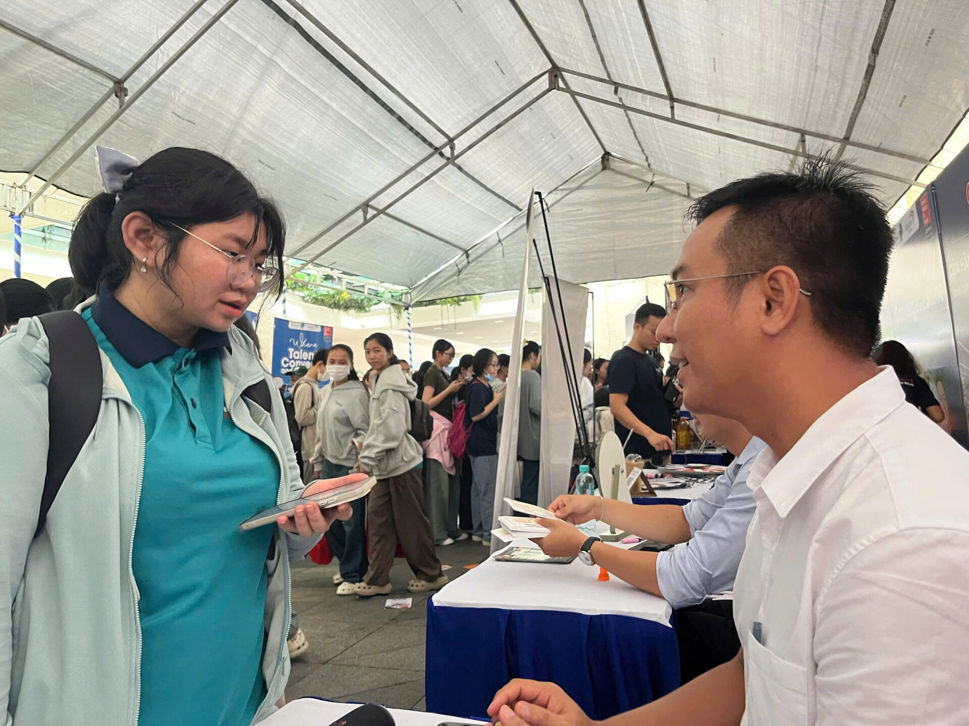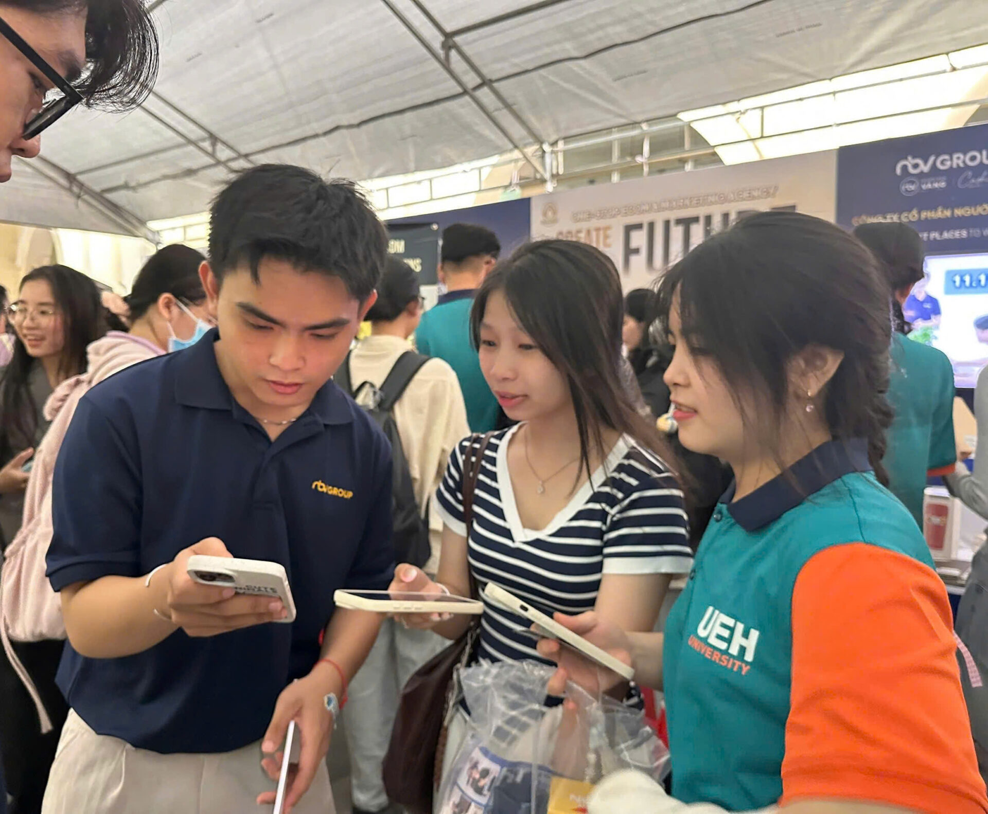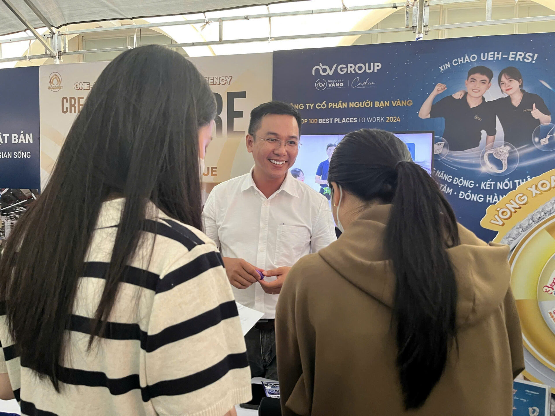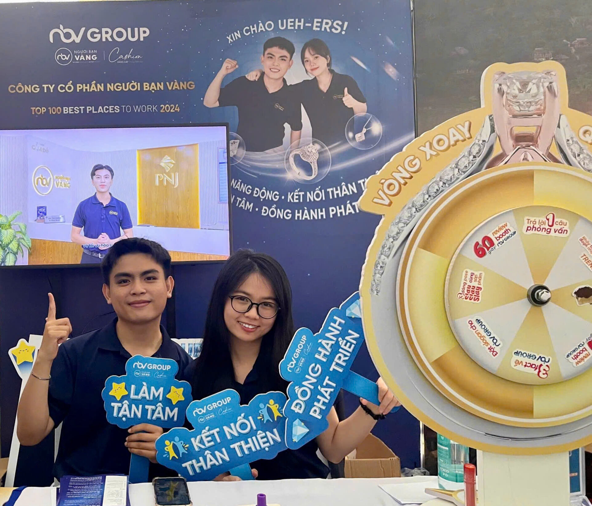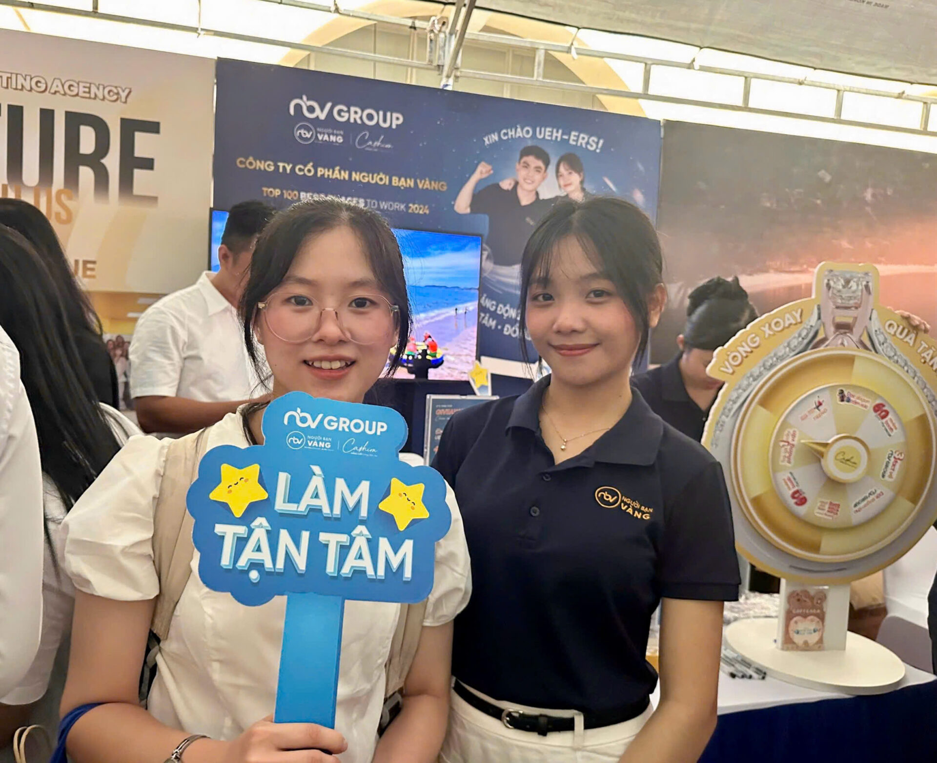 Tại gian hàng NBV, sắc vàng quen thuộc cùng không khí thân thiện nhanh chóng thu hút đông đảo sinh viên ghé thăm. Các bạn được tư vấn trực tiếp bởi đội ngũ tuyển dụng giàu kinh nghiệm, cùng chia sẻ về hành trình nghề nghiệp, kỹ năng ứng tuyển và cơ hội làm việc thực tế tại hệ thống thu mua – cầm đồ toàn quốc Người Bạn Vàng và thương hiệu Cashion.