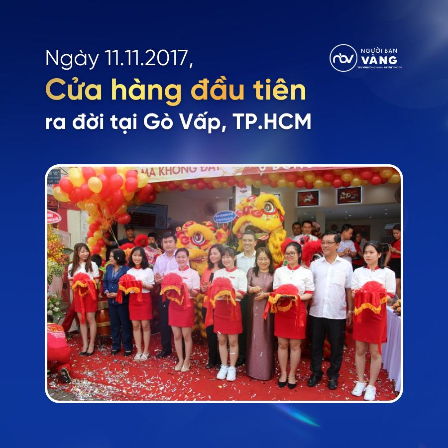Ngày 11/11/2017 đánh dấu cột mốc quan trọng khi Người Bạn Vàng chính thức ra đời với cửa hàng đầu tiên tại quận Gò Vấp, TP.HCM. Từ một điểm khởi đầu khiêm tốn, thương hiệu đã không ngừng phát triển để trở thành một trong những hệ thống thu mua – tài chính cầm cố – kiểm định uy tín hàng đầu trên thị trường hiện nay.
